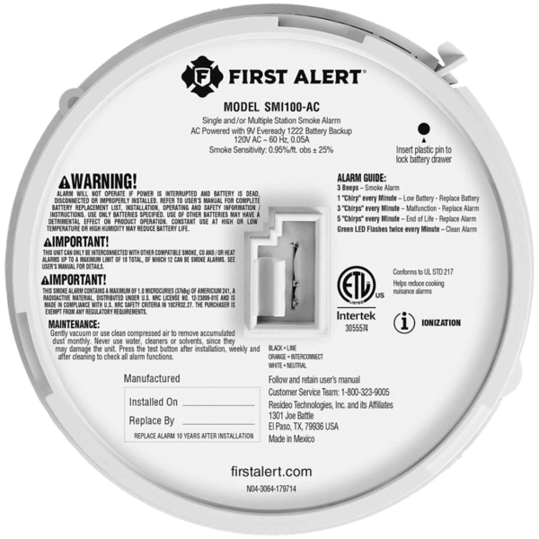 With its 120 Volt AC power supply and a reliable 9 Volt battery backup (included), your protection remains in tact even in power outages. Test that all alarm features are working properly using the full-function test button to simulate smoke conditions.